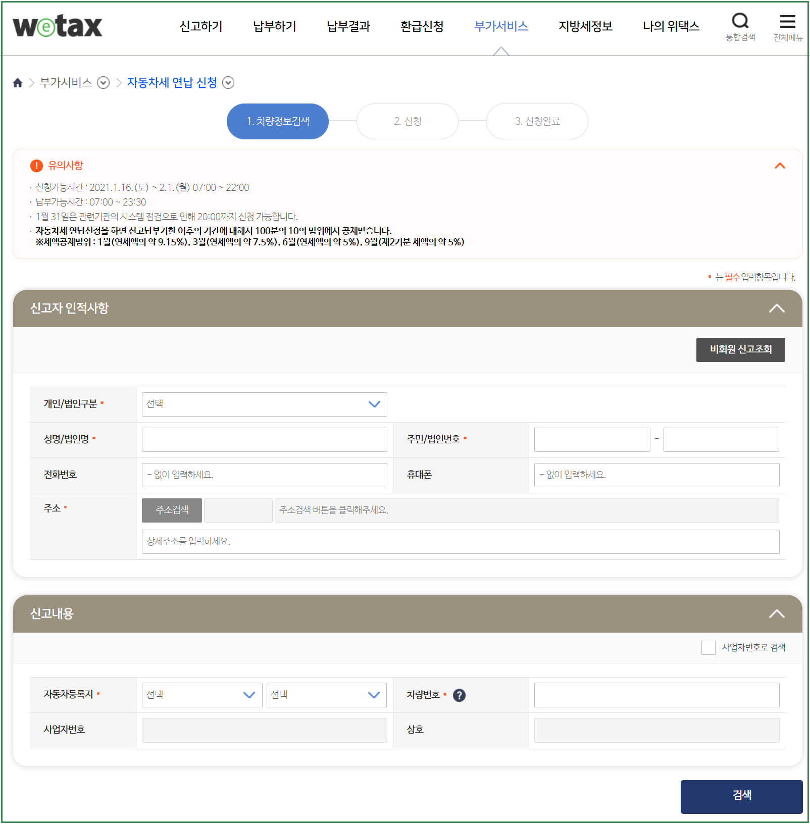 이 때는 위택스 메인페이지의 부가서비스>자동차세연납신청 메뉴를 이용하면 됩니다.