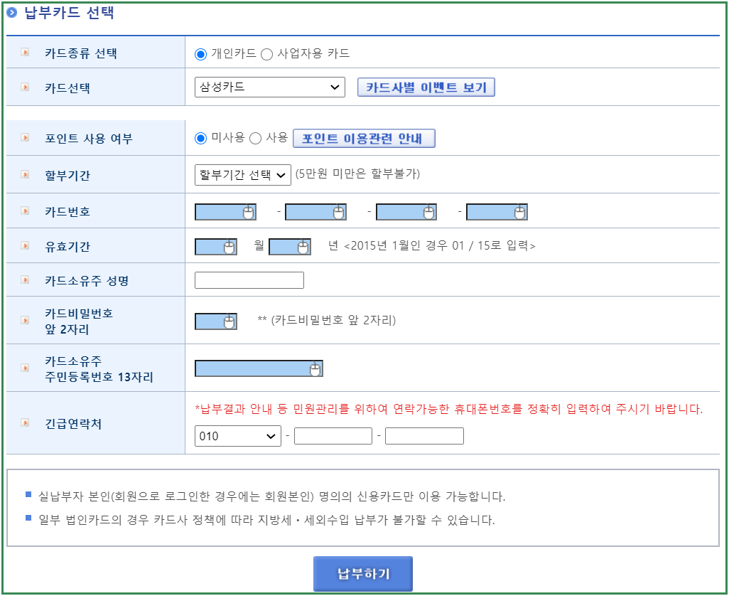 자동차세 연납 신청 후에 자동차세 납부를 할 때에는 본인 명의의 신용카드만 이용가능하니 유의하시기 바랍니다.