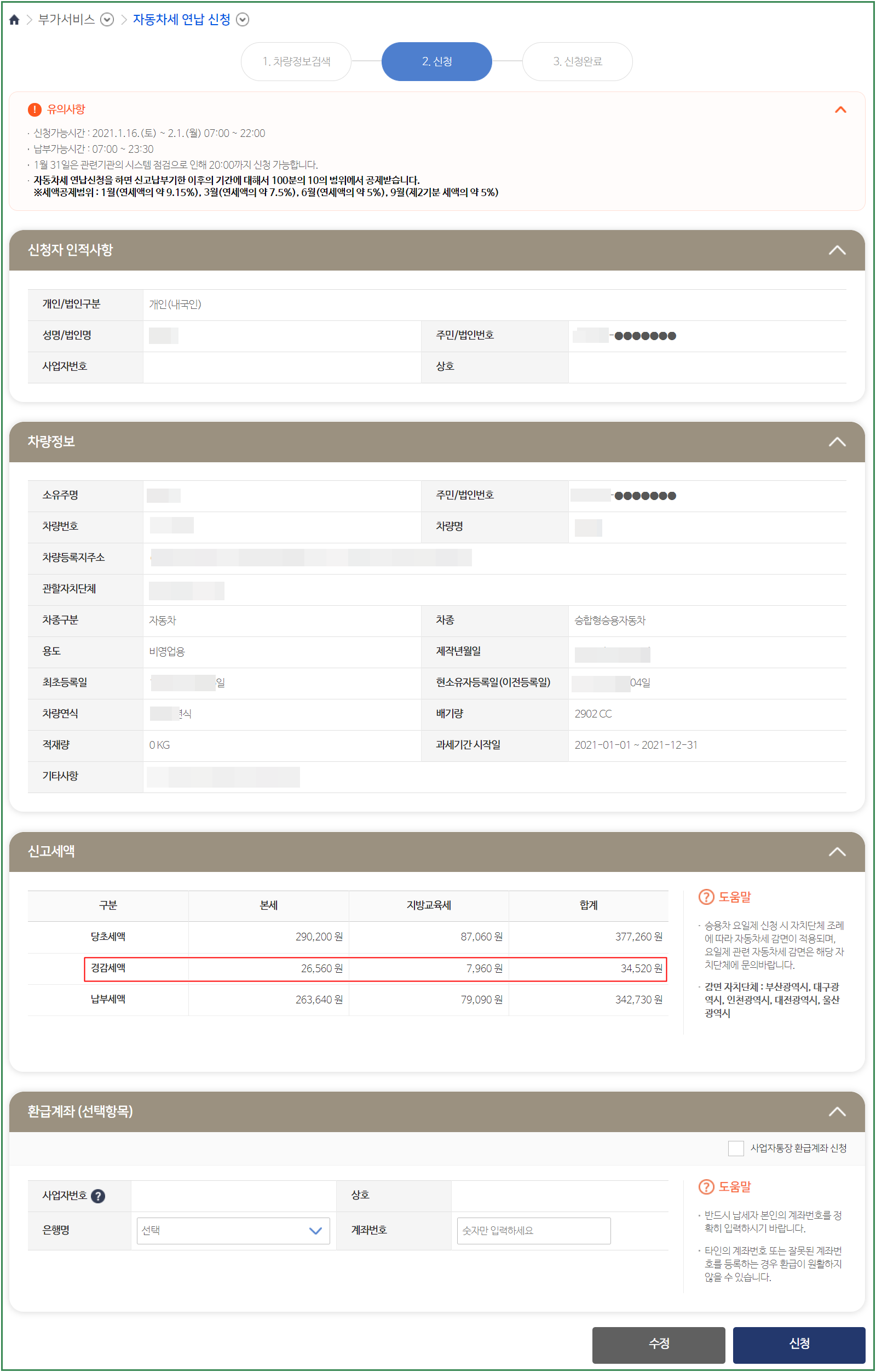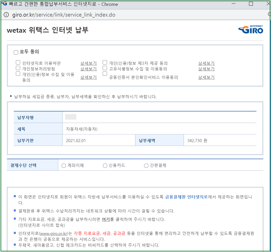 한 마디로 별도의 자동차세 연납 신청 없이도 1월 중에는 위택스에서 온라인으로 자동차세 연납으로 납부할 수 있는 것입니다.