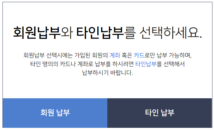 위 그림에서 납부를 클릭하게 되면 아래와 같이 회원 본인(카드/계좌) 또는 타인 명의로 납부할지 선택할 수 있습니다.