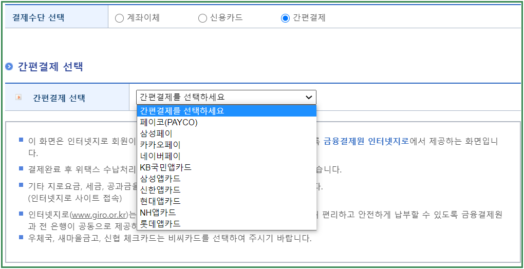 그 밖에 페이코, 삼성페이, 카카오페이 등을 이용한 자동차세 연납도 가능합니다.