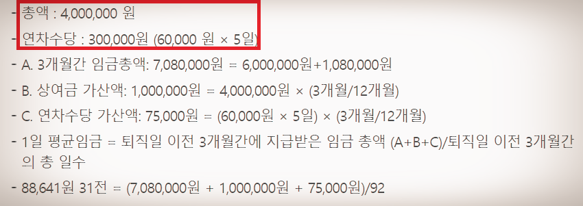 - 연간 상여금은 400만원은 12개월치에 해당하므로 퇴직전 3개월에 반영된 금액은 1/4을 반영하면 100만원입니다.