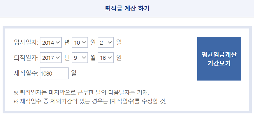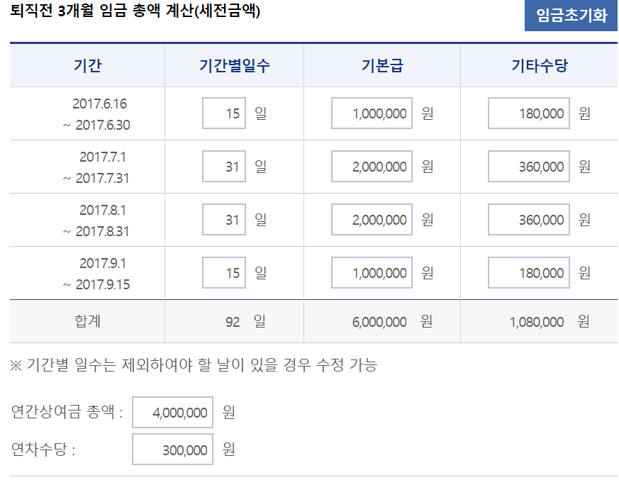 본인의 입사일자와 퇴사일자를 입력하면 자동으로 재직일수가 나오고, 최종 3개월의 임금을 입력하면 됩니다. 이 때, 매월 고정적으로 받은 수당 등도 포함합니다.