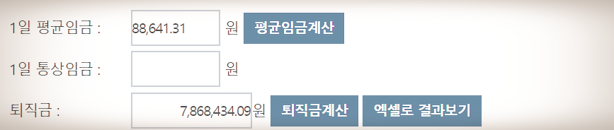 따라서, 퇴직금 계산 공식 1일 평균임금*30일*(재직일수/365)에 따라 계산하면 1일 평균임금 88,641원*30일*(1080/365) = 7,868,434원으로 위 고용노동부 퇴직금 계산기와 같은 결과가 나옵니다.