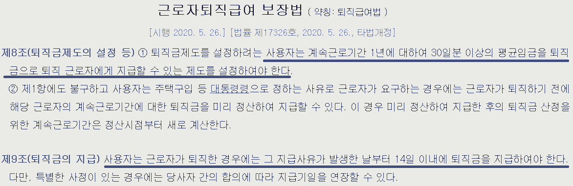 다음과 같이 근로자 퇴직급여 보장법에는 퇴직금 지급기준이 정확하게 명시되어 있습니다.
