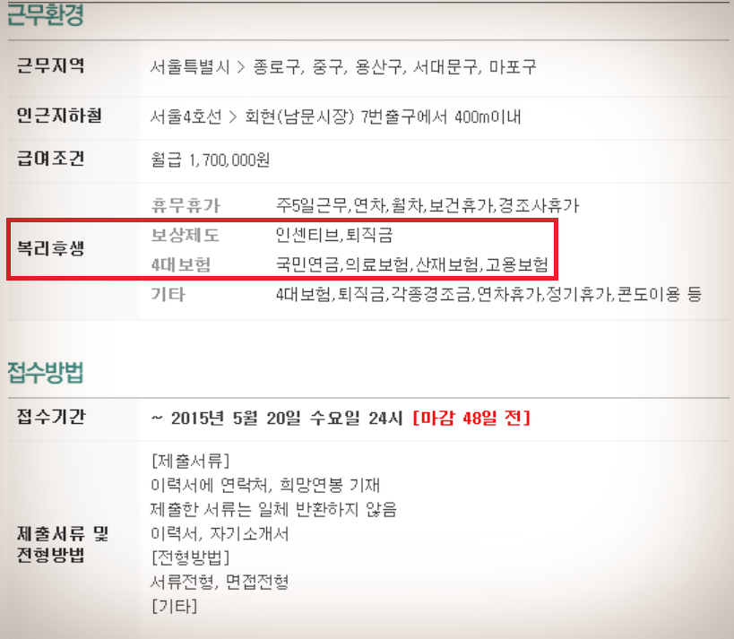 그럼에도 가끔 구인광고에 퇴직금 지급을 회사측의 자비로운 복지혜택인 것처럼 표현하기도 하는데 이것은 마치 일하면 월급을 주겠다는 것과 같이 당연한 얘기죠.
