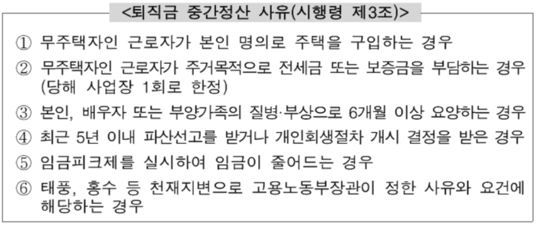 참고로 법으로 규정된 상세한 퇴직금 중간정산 사유는 아래와 같습니다.