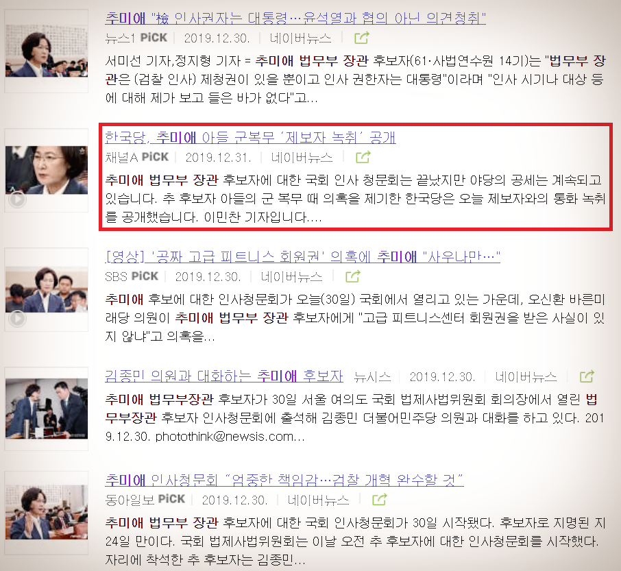 아래는 2019년 12월 30일 추미애 법무부장관후보자 시절의 당시 주요 뉴스 리스트입니다.