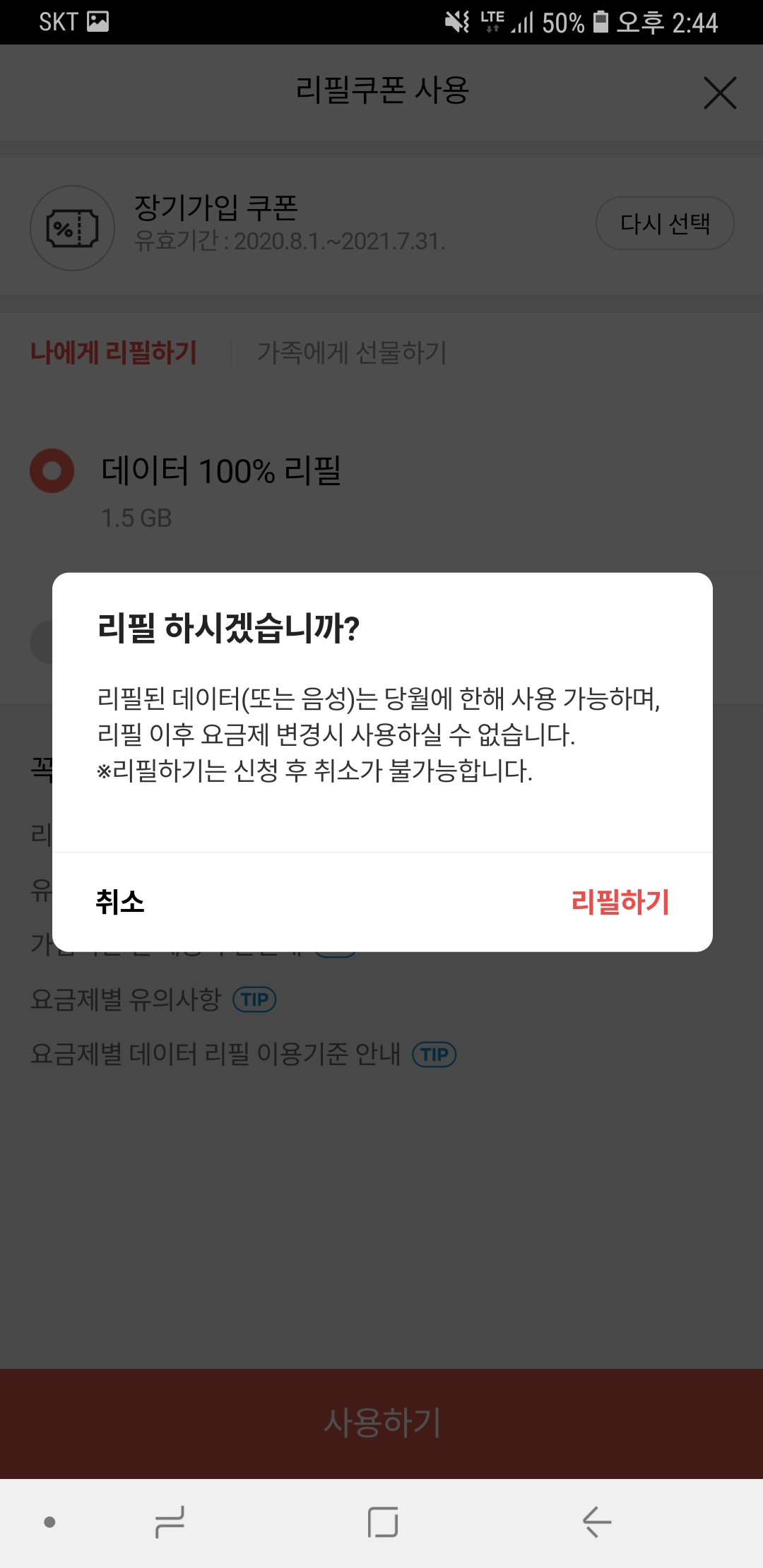 리필하기 버튼을 눌러 최종 확정을 하면 SKT 데이터 리필이 완료 됩니다.