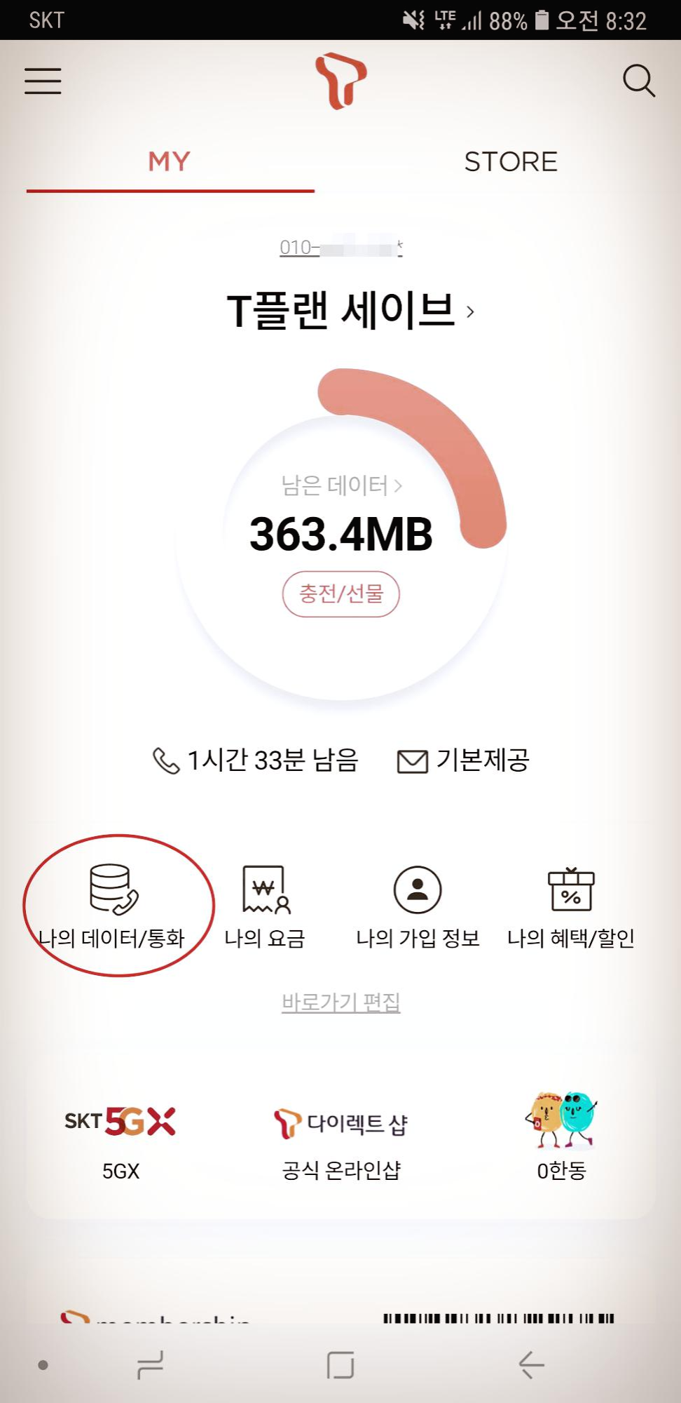 SK 유저라 티월드 홈페이지에 들어가 보니 실시간 데이터 사용량과 요금을 조회할 수 있는데 확인해 보니 SKT데이터 리필 쿠폰도 있어서 데이터 리필을 해 보았습니다.
