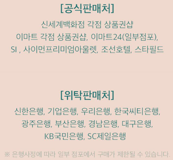 은행 위탁판매처는 5, 10만원권 상품권만 취급하며, 일부 은행지점은 취급을 하지 않을 수도 있으니 반드시 사전에 해당 지점의 판매여부 및 구매가능 수량을 확인해 보시는 것이 좋습니다.