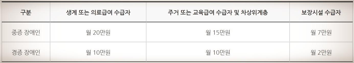 장애인 등록자 중 본인과 배우자의 월 소득이 단독가구 1,220,000원, 부부가구 1,925,000원이하인 18세 이상의 중증장애인은 다음과 같은 복지급여를 수령하실 수 있습니다.