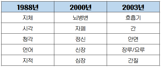 장애의 정도에 따른 등급은 단순화 되었지만 장애의 범위를 설정하는 장애유형은 1988년 최초 장애인복지법에서 규정한 이래 계속 확대되어 현재는 15종까지 확대되었습니다.